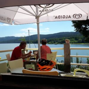 dann haben wir sehr nett direkt am See mit einem schönen Blick Mittag gegessen.