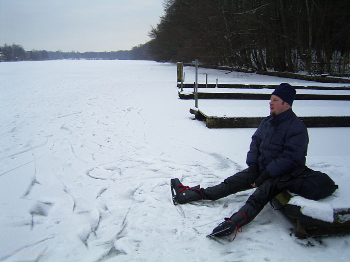 Ausruhen am Ufer auf dem Steg auf dem verschneiten Eis Ausruhen am Ufer auf dem Steg auf dem verschneiten Eis