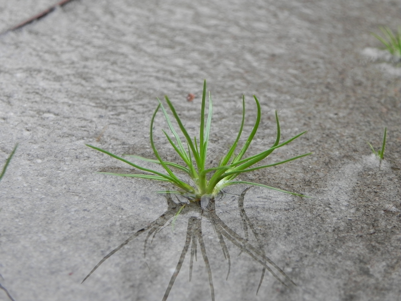 Fresh gras on the the sandy track filled with rainwater Fresh gras on the the sandy track filled with rainwater